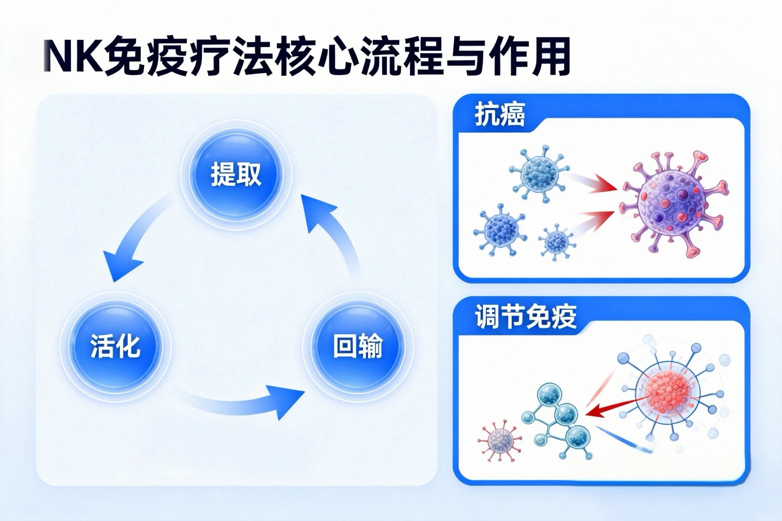 作为前沿的 NK 免疫疗法,其操作流程兼具科学性与安全性,核心在于 “提取 - 活化 - 回输” 的闭环赋能:首先通过采血方式,从患者体内提取未成熟的免疫细胞;随后将这些细胞送至专业实验室,在模拟人体生理环境的条件下进行活化培养与扩增,通过技术手段赋予其高效识别和强力杀灭肿瘤细胞的 “超能力”;最后,当细胞达到最佳活性状态时,再将其回输至患者体内,这些 “升级改造” 后的 NK 细胞,会迅速融入机体免疫系统,成为精准打击肿瘤的 “特种部队”。